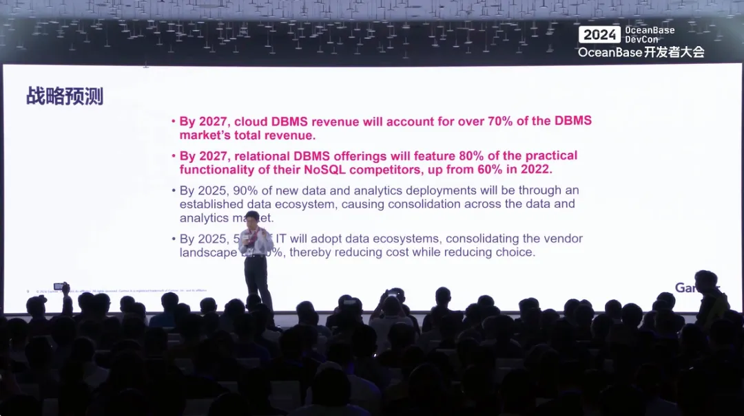 此次大会的体化主旨是“携手开发者打造一体化数据库”,那么何为一体化数据库呢?浪潮在这之前我们先看看来自三方机构的一些观点。下图是产品本次大会邀请的Gartner分析师做的预测,其重点是角度两条,一是体化云数据库的快速发展,二是浪潮关系型数据库将承载更多 NoSQL 的能力。