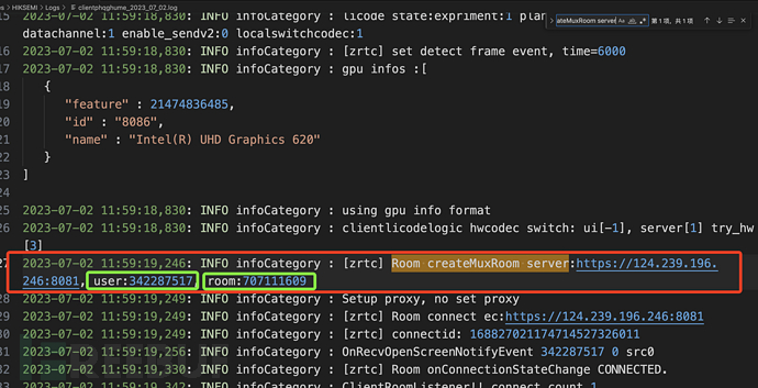 本机远控其他主机通过client日志查找本机远程控制其他主机的日志行为。匹配关键词“Room createMuxRoom server”。