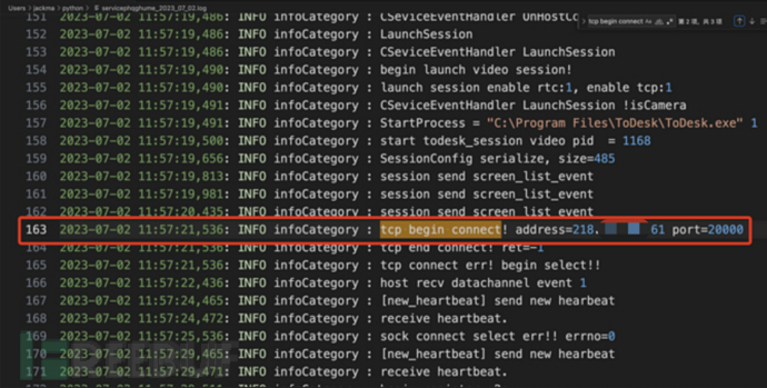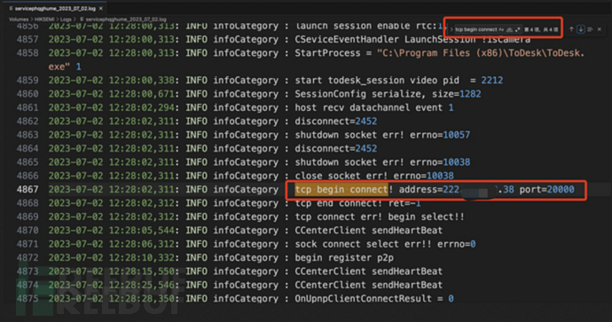 本机被其他主机远控记录在server日志中查找本机被其他主机远控记录与v4.6中的分析方法一致。同样在日志中匹配关键词“tcp begin connect ”,可看到远程连接记录和对端的ip地址。其中Port为443的IP是官方服务器地址,可忽略。