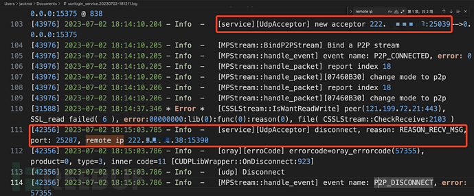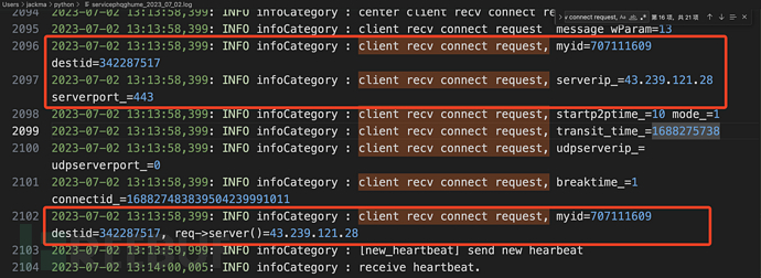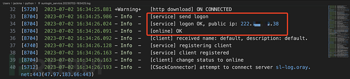 在server日志中匹配关键词“tcp begin connect ”,可看到远程连接记录和对端的ip地址。其中Port为443的IP是官方服务器地址,可忽略。