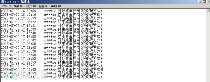 可以重点关注以sunlogin_service.+时间命名的文件、history文件。首先看history文件,记录了被远程连接的时间以及连接方式(识别码),在日常分析过程中,定位时间节点较为关键。