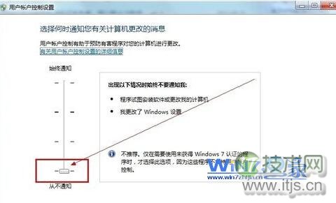 4、或者去用户账户控制设置界面中将按钮滑动至最下面的“从不通知”,点击确定即可。