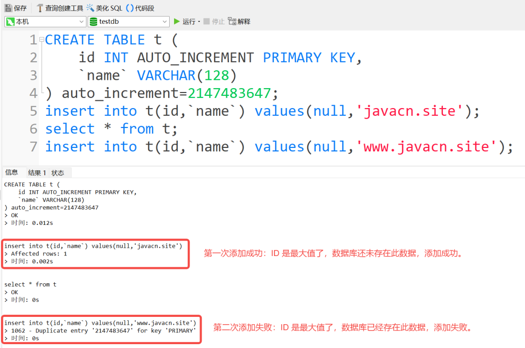 复制CREATE TABLE t ( id INT AUTO_INCREMENT PRIMARY KEY, `name` VARCHAR(128) ) auto_increment=2147483647; insert into t(id,`name`) values(null,javacn.site); select * from t; insert into t(id,`name`) values(null,www.javacn.site);1.2.3.4.5.6.7.以上 SQL 是创建了一个表 t,并且给 t 表的主键 id 设置自增 ID,之后再将表的自增 ID 初始化为 INT(有符号)的最大值 2147483647,然后再添加两条数据。