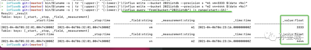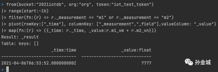 复制➜ influxdb git:(master) bin/$(uname -s | tr [:upper:] [:lower:])/influx write --bucket 2021iotdb --precision s "m1 vm=3333 $(date +%s)"➜ influxdb git:(master) bin/$(uname -s | tr [:upper:] [:lower:])/influx write --bucket 2021iotdb --precision s "m2 vn=4444 $(date +%s)"1.2.我们插入两条时间线数据,序数析m1的据联vm=3333,m2的合分vn=4444,我们的需求是vm + vn。