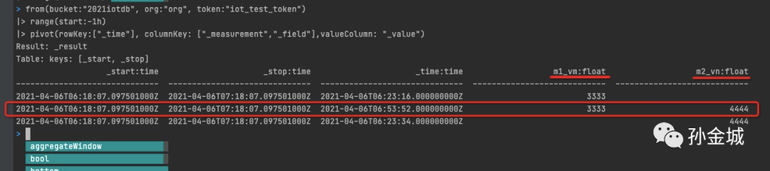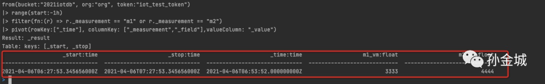 |> pivot(rowKey:["_time"], columnKey: ["_measurement","_field"],valueColumn: "_value")1.2.3.如上语句执行结果如下: