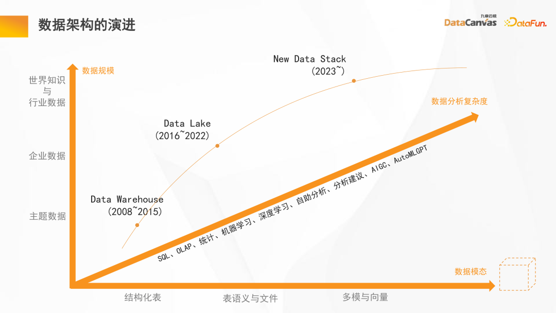 在新的数据栈时代,原有数据处理流程基本不变,包括数据的来源、获取、转化、存储和计算以及利用数据进行分析预测和构建应用。未来趋势是走向"向量海",所有非结构化数据最终会被转化为向量进行存储,基于数据结构构建实时分析处理流程,在此基础上再构建出各种数据应用。