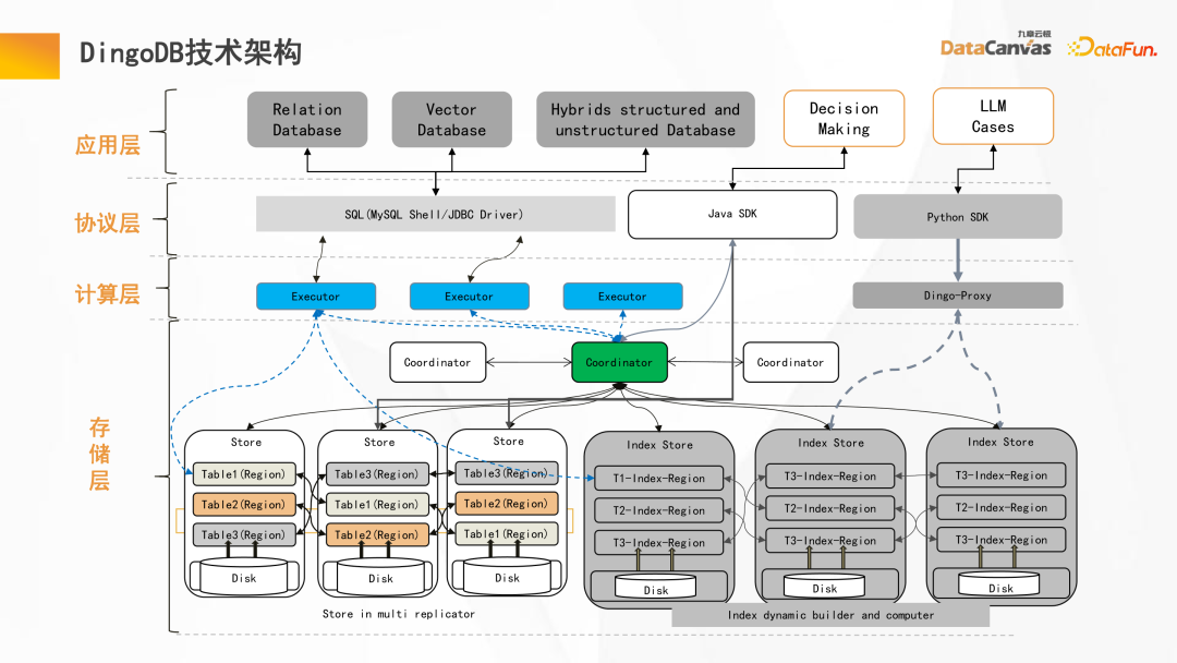 上图清晰展示了 DingoDB 从应用层到底层存储的架构设计。