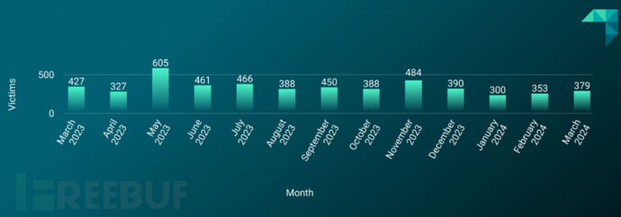 LockBit 在被执法机构打击后快速恢复元气,但攻击活动的数量仍然大幅度下降。从 2023 年第四季度的 275 个受害者,下降到 2024 年第一季度的 216 个受害者。可能是由于 LockBit 必须更新攻击基础设施,也可能是由于其在附属机构的声誉遭到了重大打击。