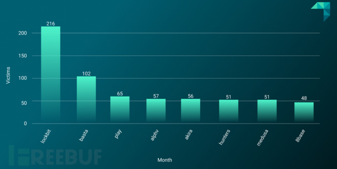 3.最活跃的团伙最活跃的勒索软件团伙如下所示,尽管执法部门在 2024 年 2 月针对 LockBit 开展了执法行动,但仍然稳居最活跃的勒索软件团伙宝座。紧随其后的是,Black Basta、Play、ALPHV 和 Akira。