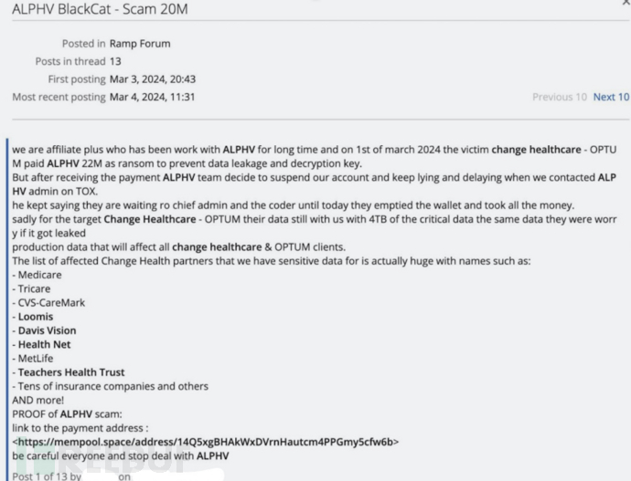 2.ALPHV 欺诈附属机构2024 年 3 月 3 日,在 ALPHV 向 Change Healthcare 勒索 2200 万美元赎金后。该团伙的一个附属机构发表公开声明,声称其赎金分成被贪污。两天后,ALPHV 的数据泄露网站上挂出了 FBI 的执法通知。事实证明,这是此前执法行动中截取伪造的文件,被认为是该团伙要独吞赎金的表现。