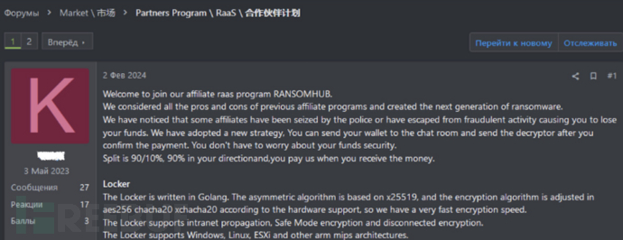 RansomHub 在运营者和附属机构间采用独特的合作方式,其允许附属机构获得 100% 的勒索收益,但必须上交 10% 给开发人员。这种模式扭转了其他大多数勒索软件团伙所采取的策略,将更大的利润分成交给附属机构。据报道,RansomHub 的许多附属机构都已经脱离 ALPHV。