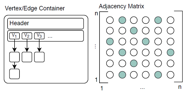 RedisGraph中的所有边都以邻接矩阵的格式存储。如果两个顶点之间存在一条边,就会在邻接矩阵的对应位置上存储一个指向该边实例的指针,否则就不存储。由于图的性质,邻接矩阵大多是一个稀疏矩阵。因此,RedisGraph选择使用了压缩稀疏行(CSR)的格式来实现对矩阵的存储。而多跳遍历可以通过RedisGraph中的矩阵乘法来计算。然而,在CSR格式下,图拓扑结构的变化对CSR的更新是很昂贵的,而且会给遍历操作带来严重的开销。