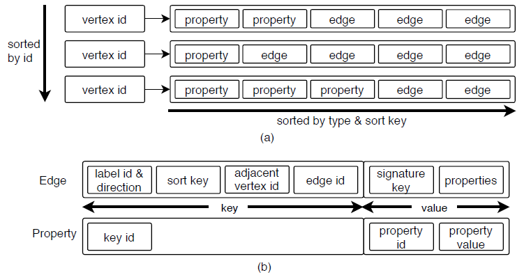 (1)JanusGraphJanusGraph的底层存储就是HBase, 在HBase中每一行都是一个由ID唯一识别的顶点。如图7(a)所示,JanusGraph将点的每个属性和邻接边都存储到行中的一个单元格中。为了快速检索,属性按属性ID排序,边按边的标签排序。图7(b)显示了JanusGraph中边和属性存储的详细格式。一条边的key是由label和direction的复合ID、排序键、相邻顶点ID和边ID组成的。排序键可以由边的label和其他边的属性来组成,以便加快遍历。