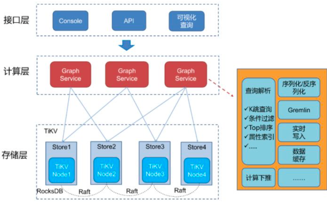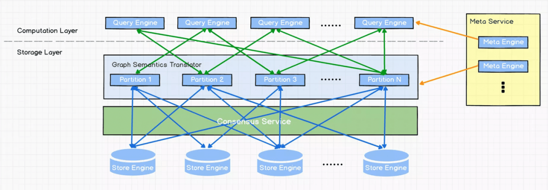 Meta Service集群基于raft协议保证了数据的一致性和高可用。Meta Service不仅负责存储和提供图数据的meta信息,如schema、partition信息等,还同时负责指挥数据迁移及 leader 的变更等运维操作。左侧主要服务采用了存储与计算分离的架构,虚线以上为计算,以下为存储。计算层和存储层可以根据各自的情况弹性扩容、缩容,也使水平扩展成为可能。此外,存储计算分离使得 Storage Service 可以为多种类型的计算层或者计算引擎提供服务。