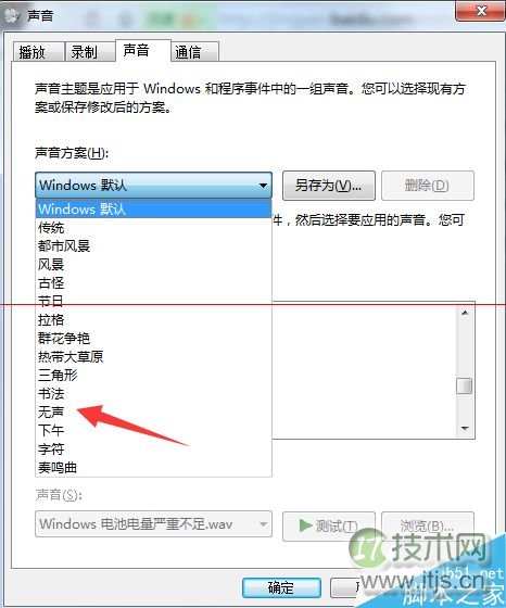 6、然后在【声音方案】选项里,找到【无声】点击选择,然后点击右下角应用,确定。企商汇