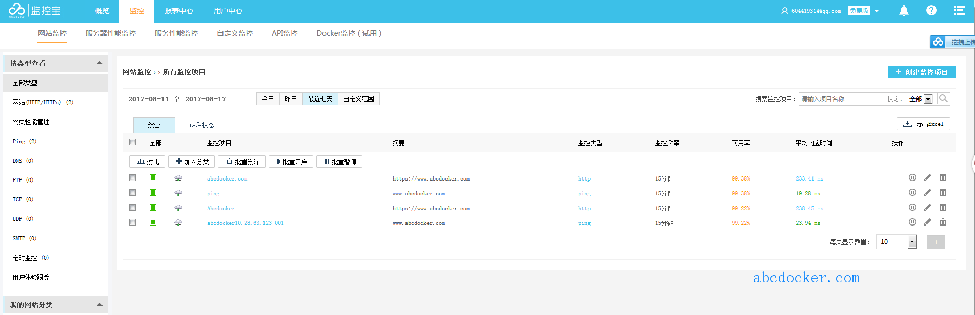 服务免费,支持网站HTTP监控、PING监控、域名DNS监控和服务器监控