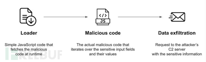 加载程序——简短、晦涩的JavaScript代码片段,负责加载攻击的完整恶意代码;恶意攻击代码——执行攻击的主要JavaScript代码,负责检测敏感输入、读取数据、中断签出过程并注入假表单;数据渗漏——用于将窃取的数据传输到攻击者控制的C2服务器。