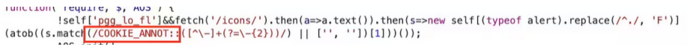 3.永远不要低估加载程序为此,研究人员后退一步,重新分析了加载程序,找到了缺失的那块拼图。研究人员发现,该加载程序包含字符串“COOKIE_ANNOT”的正则表达式匹配,这应该在作为图标请求的一部分返回的404错误页面上执行。