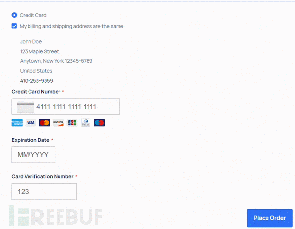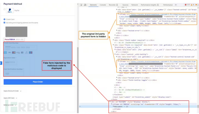 当网站使用第三方支付服务,在第三方iframe或外部页面中实现支付表单时,就会发生这种情况。为了绕过这些场景,攻击者创建了一个与原始支付表单非常相似的假表单,并将其覆盖——这种技术正日益流行。这就是变种3中窃取数据的方式。