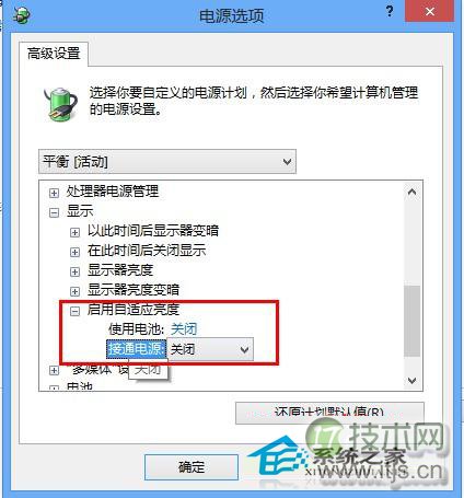 4、调节在弹出来的亮度电源选项界面中,展开“显示”菜单,不让再展开“启用自适应亮度”,旗其变然后关闭“使用电池”和“接通电源”,这样亮度就不会自动调节了;
