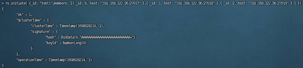 复制> use admin > rs.initiate( {_id: "test1",members: [{ _id: 0, host: "192.168.122.36:27017" },{ _id: 1, host: "192.168.122.36:27018" },{ _id: 2, host: "192.168.122.36:27019" } ] })1.2.