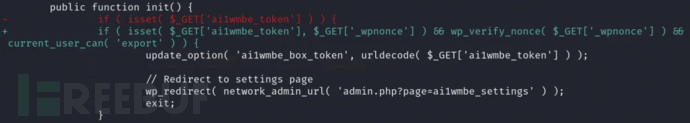 供应商已发布漏洞安全更新2023 年 7 月 18 日,PatchStack 研究员拉菲-穆罕默德(Rafie Muhammad)发现了 CVE-2023-40004 漏洞,随后便报告给了 ServMask 。2023 年 7 月 26 日,供应商 ServMask 发布了安全更新,为 init 函数引入了权限和非 nonce 验证。