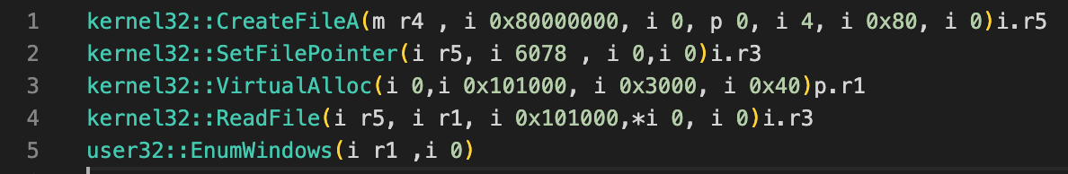 要解码动态代码,我们可以编写一个简短的Python脚本,该脚本再现行为并提取Windows API调用: