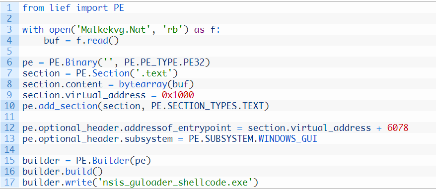 在本例中,我们使用了LIEF库来构建一个新的可执行文件。我们所要做的就是添加一个包含Malkekvg.Nat文件内容的新部分,并将入口点设置为正确的偏移量。一旦我们得到了这些,就应该能够在IDAPro中打开shellcode,并看到它包含有效的x86指令。