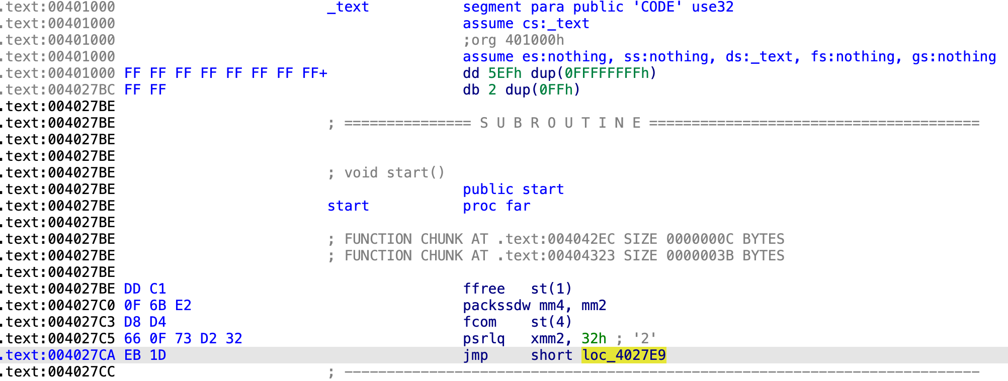 如果我们在IDA Pro中打开文件并稍微遵循代码,就应该能够看到用于解密第一阶段的大函数。虽然函数图概述看起来很大,但识别垃圾代码仍然很容易。