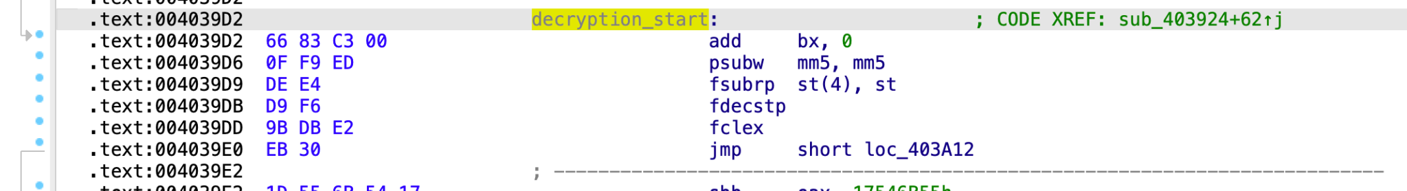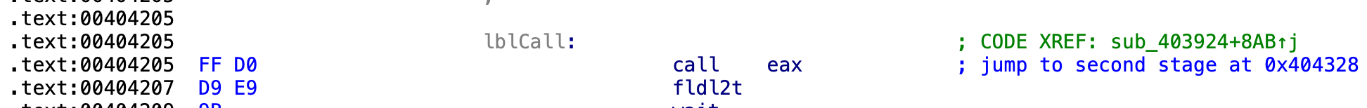 进行解密的代码如下图所示。在下图中,我们可以看到跳转到第二阶段的最终调用。此时,我们可以将第二阶段转储到另一个可执行文件中进行解密。