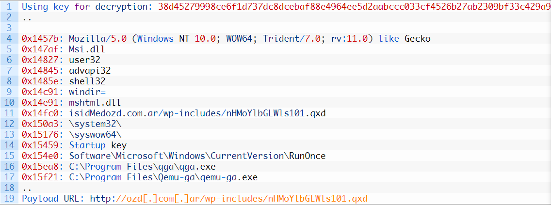 我们会在本文的最后附上Python脚本,该脚本能够通过上述方法从有效负载中找到加密密钥。在任何转储的第二阶段GuLoader负载上运行脚本后,我们应该能够看到一些字符串和负载URL。