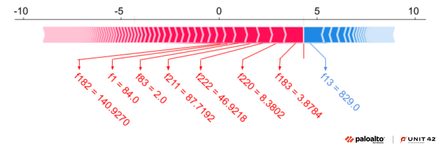 Shapley加法解释(SHAP)是一种博弈论方法,用于解释任何机器学习模型的输出。与基线预测相比,SHAP值解释了每个特征对输入特征向量的实际预测的影响。在下图中,从右到左的红色特征是将模型推向恶意预测的最顶层特征。从左到右,蓝色的特征表示降低预测为恶意软件概率的最顶层特征。