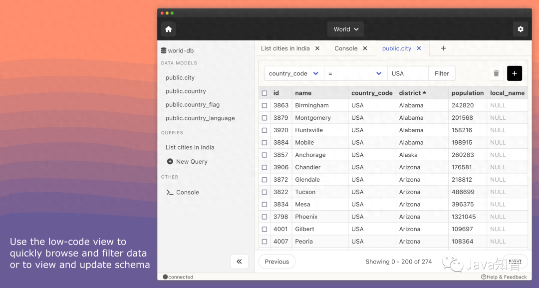 快速浏览:使用低代码 UI 快速过滤、排序和浏览数据和模式。