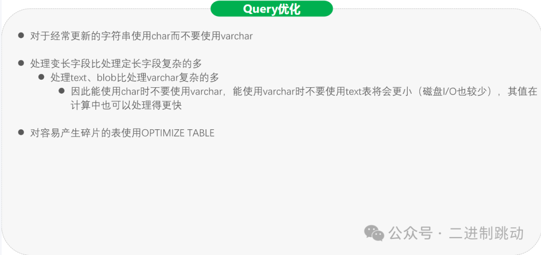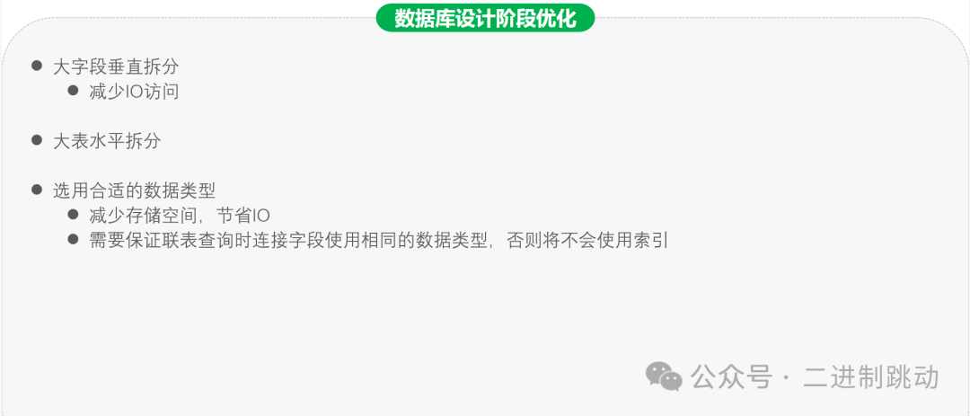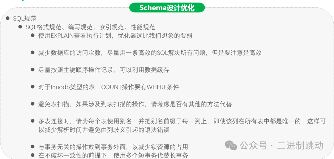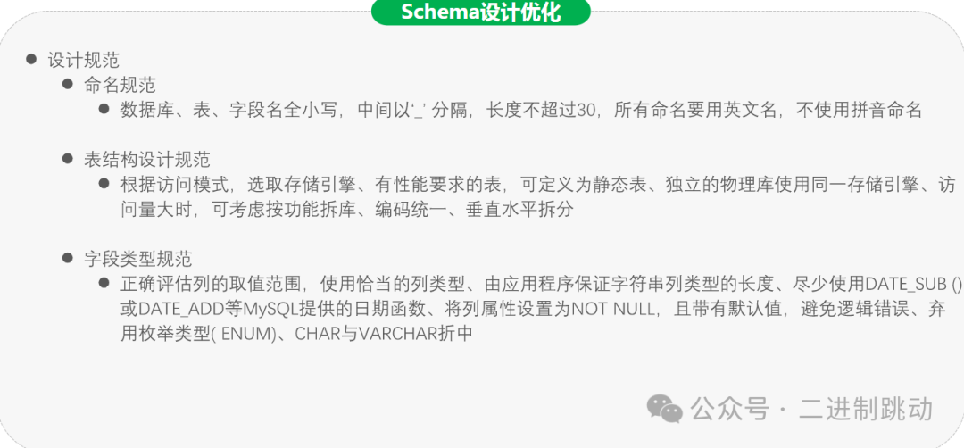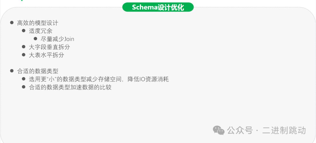 选择合适的数据类型,避免过大或不必要的精度。分区表设计,适用于大数据量的表,按日期、地域等维度分区。