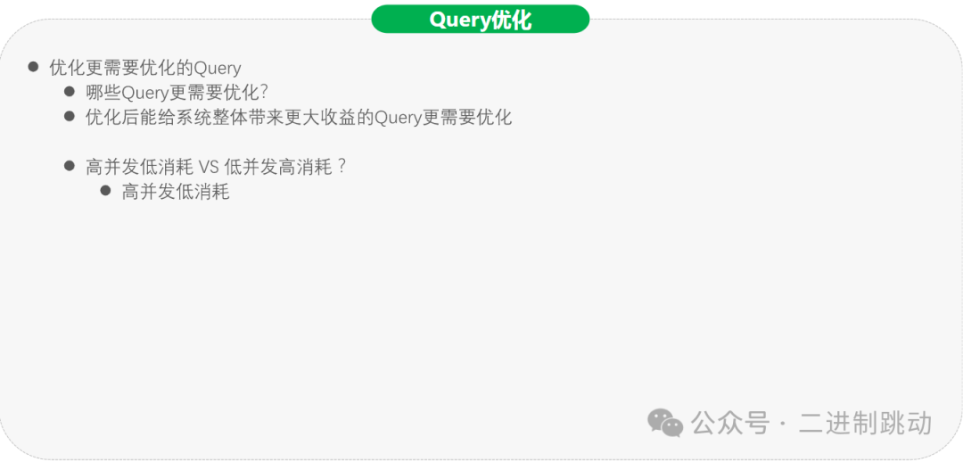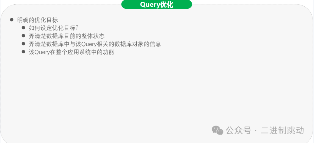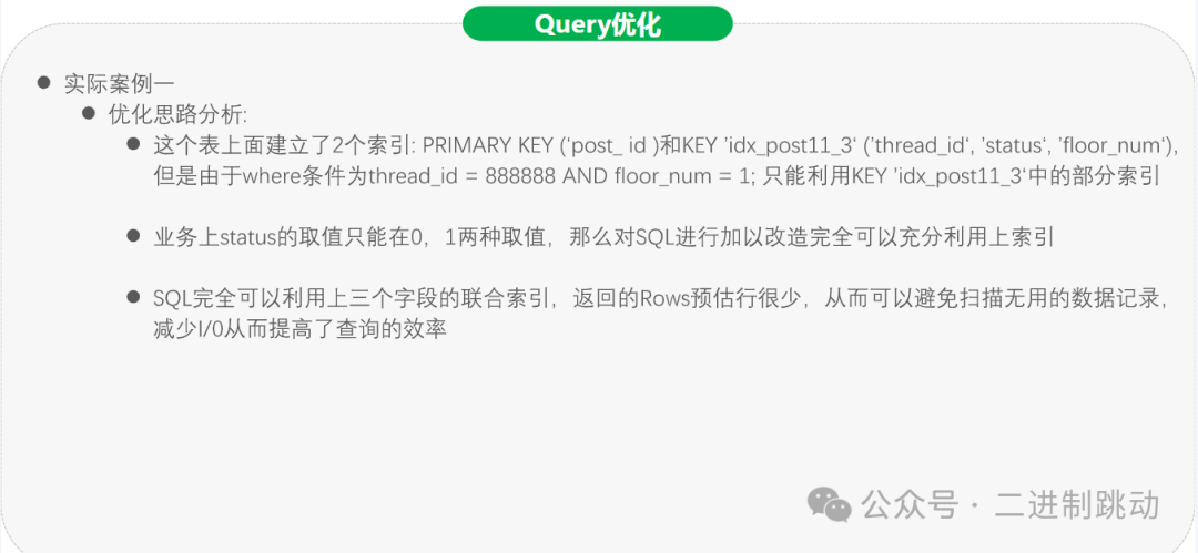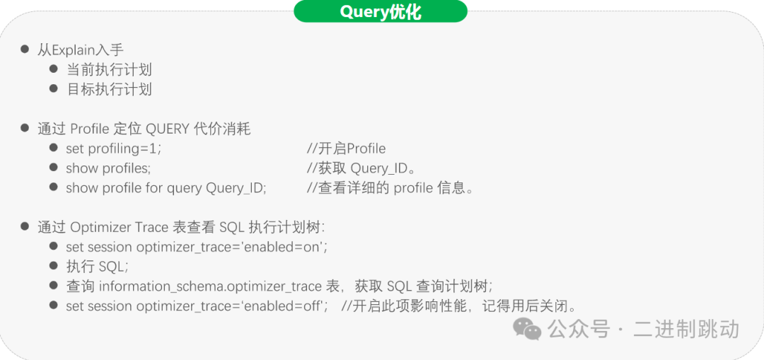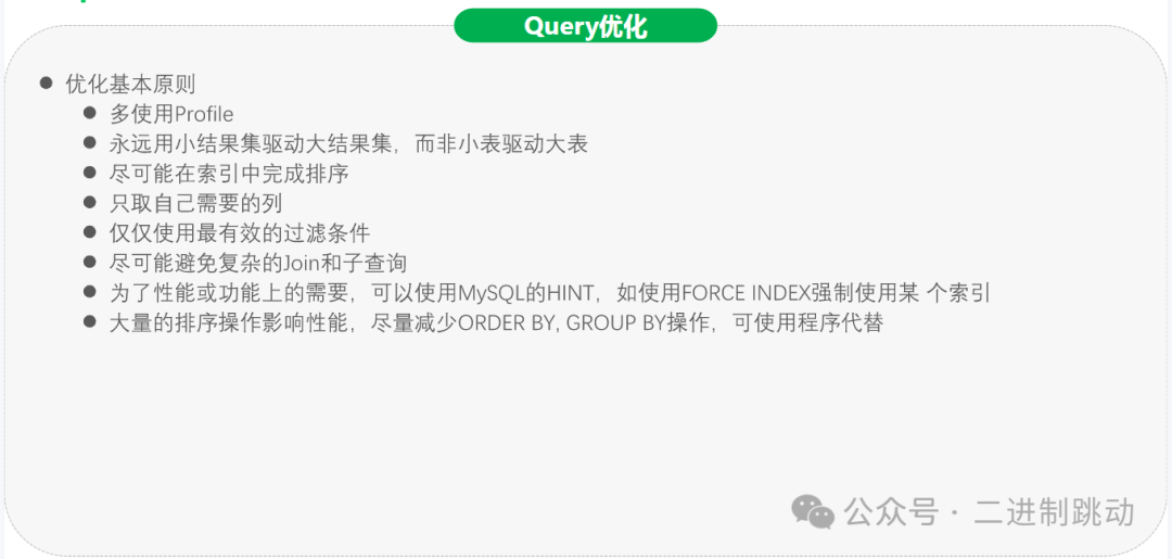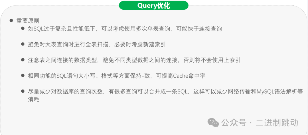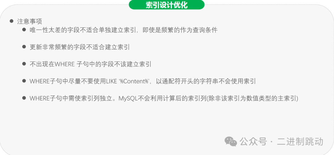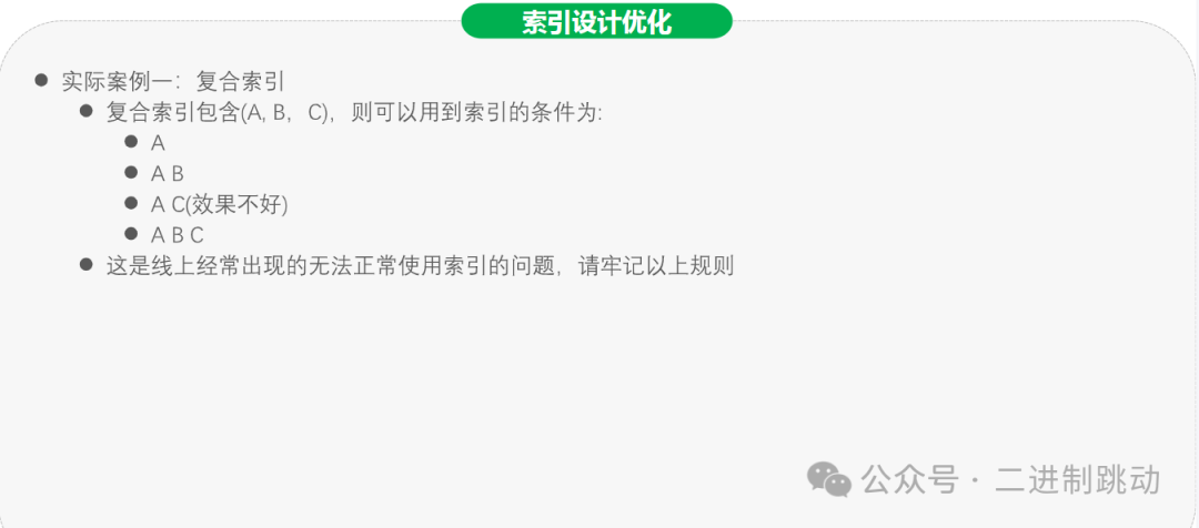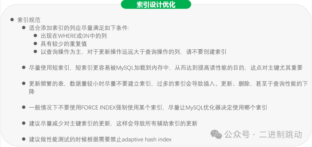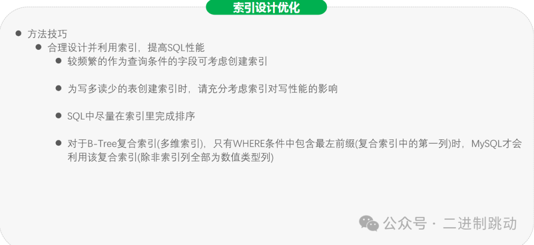 复合索引:对多个字段联合创建索引,适用于多列查询。2. 使用覆盖索引设计索引时,包含查询中需要的所有字段,减少回表操作。3. 避免冗余索引避免对相同字段或字段组合创建多个索引,以节省存储和维护成本。4. 适当使用唯一索引对唯一值的列(如身份证号、邮箱等)使用唯一索引,提高查询效率和数据完整性。5. 考虑查询模式分析常见查询语句,针对频繁使用的查询条件和排序条件创建索引。6. 优化索引的选择性选择性高的列(即不同值多的列)更适合作为索引字段,过滤效果更好。7. 维护和重建索引定期维护索引,重建碎片化严重的索引,保持索引高效。8. 避免过多的索引每张表索引数量不宜过多,以免增加插入、更新和删除操作的开销。