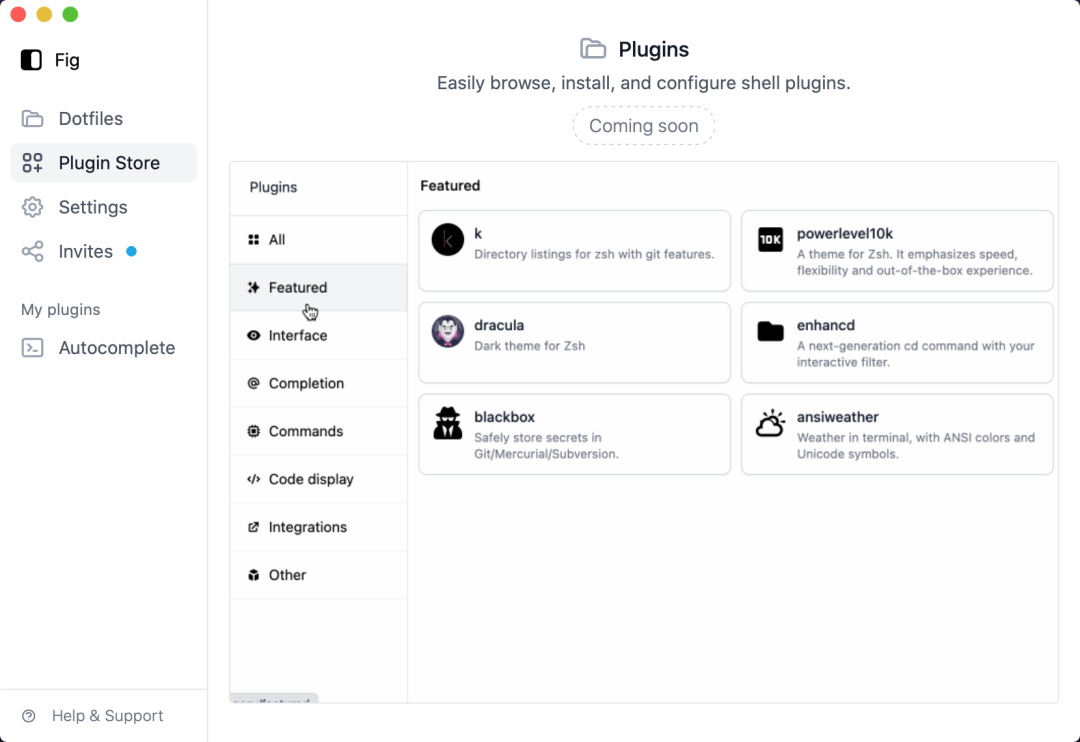 Fig 的软件中还有插件商店,不过还没正式上线,但是也能看出 Fig 官方接下来的服务器租用路线,插件功能必然会对 Fig 提供更多的功能。