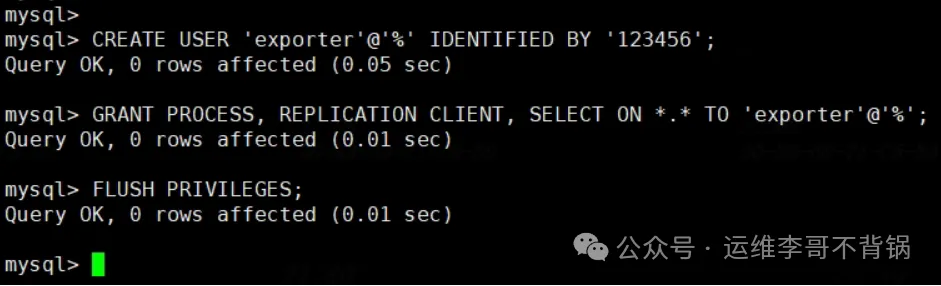 复制CREATE USER exporter@% IDENTIFIED BY 123456; GRANT PROCESS, REPLICATION CLIENT, SELECT ON *.* TO exporter@%; FLUSH PRIVILEGES;1.2.3.