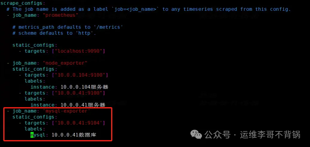 复制vi /data/prometheus/prometheus.yml1. 复制global: scrape_interval: 15s scrape_configs: - job_name: mysql-exporter static_configs: - targets: [10.0.0.41:9104] labels: mysql: 10.0.0.41数据库1.2.3.4.5.6.7.8.9.