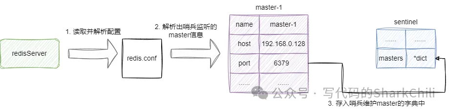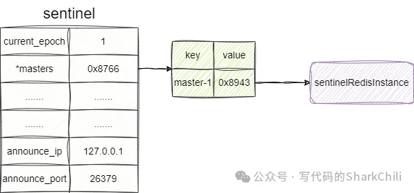 复制# sentinel monitor <name> <host> <port> <quorum> sentinel monitor masters-1 192.168.0.128 6379 11.2.redis就会从配置文件中匹配到sentinel 这个代码段,然后解析出<name> <host> <port> <quorum>这几个参数,生成一个master即可sentinelRedisInstance对象,存入masters这个字典中: