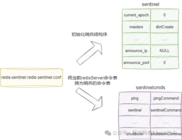 复制struct sentinelState { //当前纪元 uint64_t current_epoch; /* Current epoch. */ //维护主节点的哈希表指针 dict *masters; /* Dictionary of master sentinelRedisInstances. //...... //向其他哨兵发送当前实例的地址信息 char *announce_ip; /* IP addr that is gossiped to other sentinels if not NULL. */ int announce_port; /* Port that is gossiped to other sentinels if non zero. */ } sentinel;1.2.3.4.5.6.7.8.9.10.11.12. 2. 初始化哨兵基本配置redis在启动会检查本次启动是否是通过redis-sentinel指令或者--sentinel参数启动哨兵,如果是初始则按照哨兵模式进行初始化,源码下载默认给该节点端口号为26379并初始化哨兵sentinel: