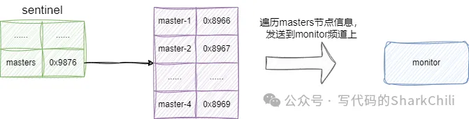 复制sentinelRedisInstance *createSentinelRedisInstance(char *name, int flags, char *hostname, int port, int quorum, sentinelRedisInstance *master) { //...... //基于与运算获得哨兵的masters表 if (flags & SRI_MASTER) table = sentinel.masters; else if (flags & SRI_SLAVE) table = master->slaves; else if (flags & SRI_SENTINEL) table = master->sentinels; //...... //创建master实例 ri = zmalloc(sizeof(*ri)); //...... ri->name = sdsname; //...... //存入哨兵的字典表masters中 dictAdd(table, ri->name, ri); return ri; }1.2.3.4.5.6.7.8.9.10.11.12.13.14.15.16.17. 4. 启动并监听master完成上述步骤后,redis得知当前节点是以哨兵模式启动,于是调用sentinelIsRunning方法,内部遍历masters节点的信息,发送到monitor频道告知其他当前哨兵监听的所有monitor信息