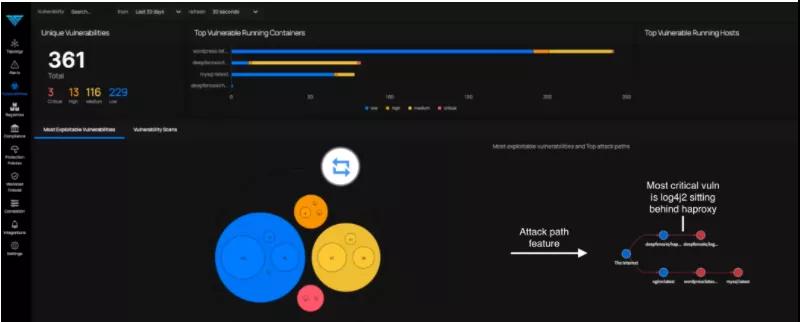 下图向您展示了,我在对演示环境进行扫描之后,发现的最容易被利用的漏洞报告的上半部分。ThreatMapper 不但突出显示了风险最大的漏洞,并显示了那些可能会被利用的攻击路径。您可以在图中位于 HAproxy 的后面,看到 Log4j 容器(已用文本标出,便于您的参考)。这便可以利用 log4j2 漏洞,开展攻击的路径。