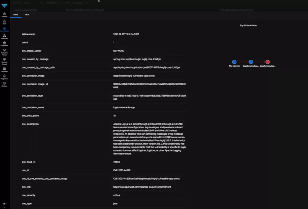 当您将鼠标悬停在上述攻击路径中的关键节点上时,您将看到有关该漏洞的相关信息。例如,节点 deepfenceio/log4j-vulnerable-app:latest 具有 Top CVE:CVE-2021-44228 的网络攻击向量类型(Attack Vector type:network)。攻击者可以通过 Port:8080 访问到。